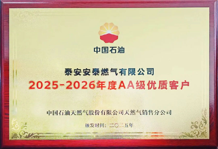 近日,泰安安泰燃?xì)庥邢薰颈恢袊?guó)石油天然氣股份有限公司天然氣銷(xiāo)售分公司授予“2025—2026年度AA級(jí)優(yōu)質(zhì)客戶(hù)”榮譽(yù)稱(chēng)號(hào)。該榮譽(yù)是中國(guó)石油對(duì)合作企業(yè)的高度認(rèn)可,更是對(duì)公司長(zhǎng)期以來(lái)深耕能源保障、恪守契約精神、積極履行社會(huì)責(zé)任的權(quán)威肯定。